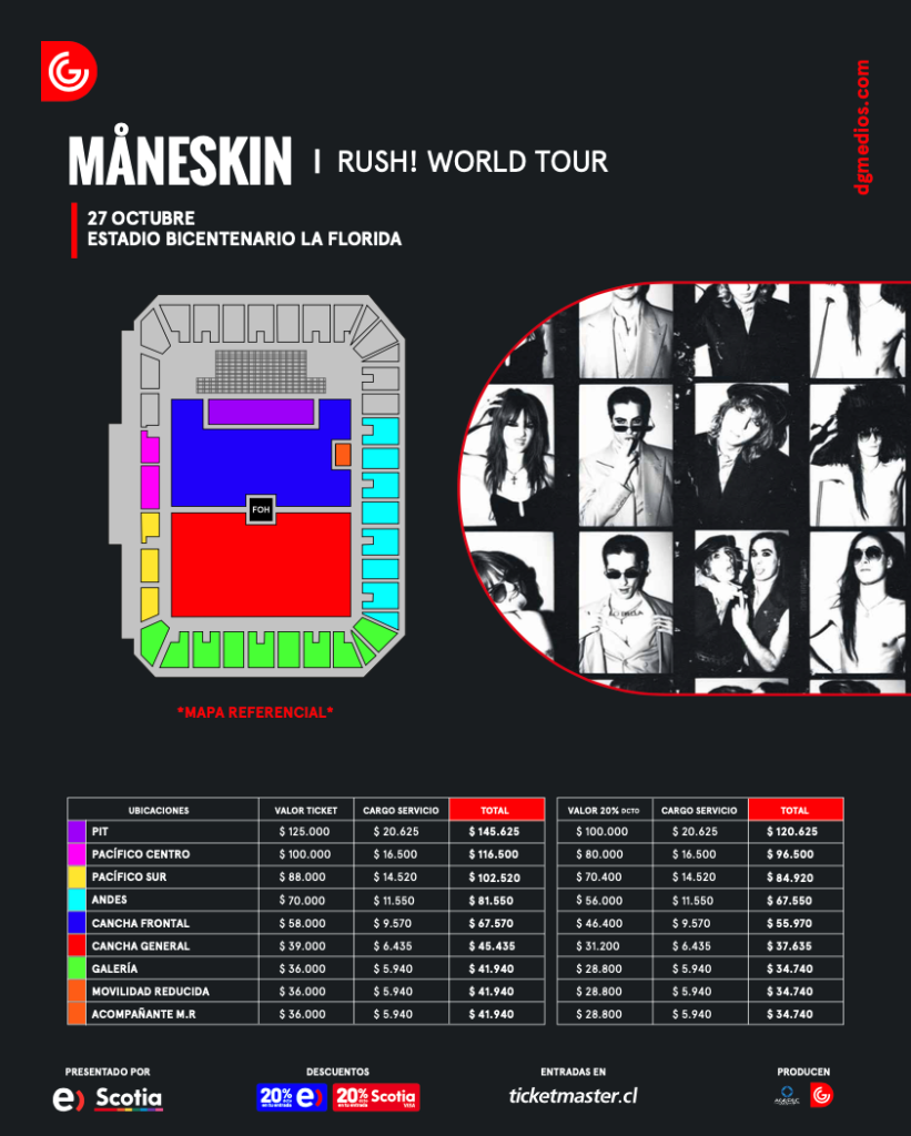Los tickets en preventa estarán disponibles con un 20% de descuento exclusivo para clientes Entel o pagando con Tarjetas Scotia, desde las 11 de la mañana del día lunes 20 de marzo y estarán disponible por 48 horas. La venta general comenzará el miércoles 22 a las 11.01am. Ambas modalidades en Ticketmaster. Puedes revisar los lugares y sus precios abajo: