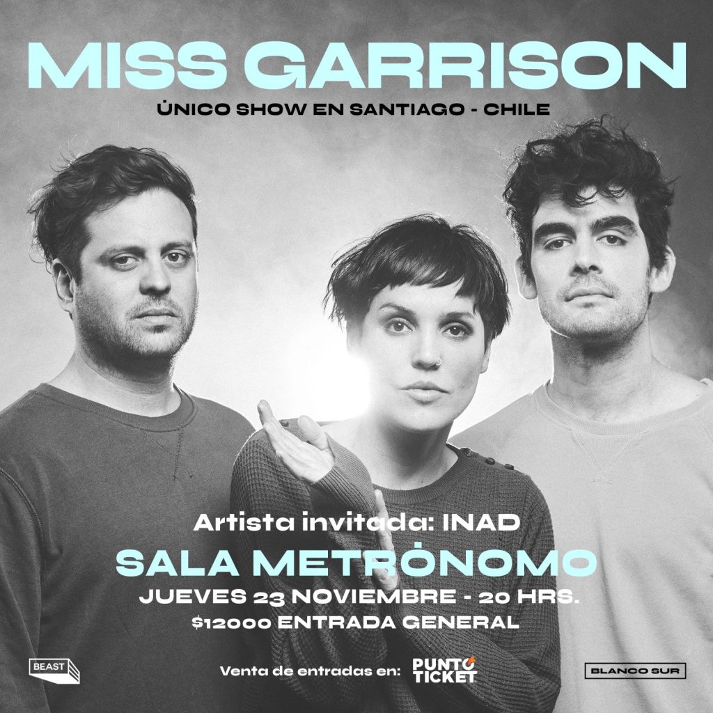 Miss Garrison es una agrupación chilena integrada por Francisca Straube, Tomás Rivera y Rodrigo de la Rivera, que desde su debut en 2010 llamaron la atención de oyentes y medios por una especial propuesta visual y sonora con elementos de Rock, Punk, Electrónica y Noise. Luego de varias publicaciones discográficas y conciertos en múltiples festivales nacionales e internacionales, la banda decidió tomarse un receso en 2018 para dedicarse a otros proyectos. Hace un par de meses, el grupo dio la sorpresa con el anuncio de su regreso a los escenarios con una fecha en Concepción y otra en Santiago.