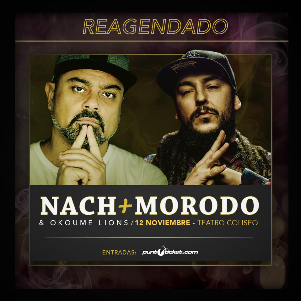 Informamos a todos los fanáticos de Morodo y Nach, que por razón de conocimiento público y como medida preventiva al coronavirus, el concierto pactado para el jueves 19 de marzo en Teatro Coliseo, se suspende y reprograma para el 12 de noviembre en el mismo recinto.