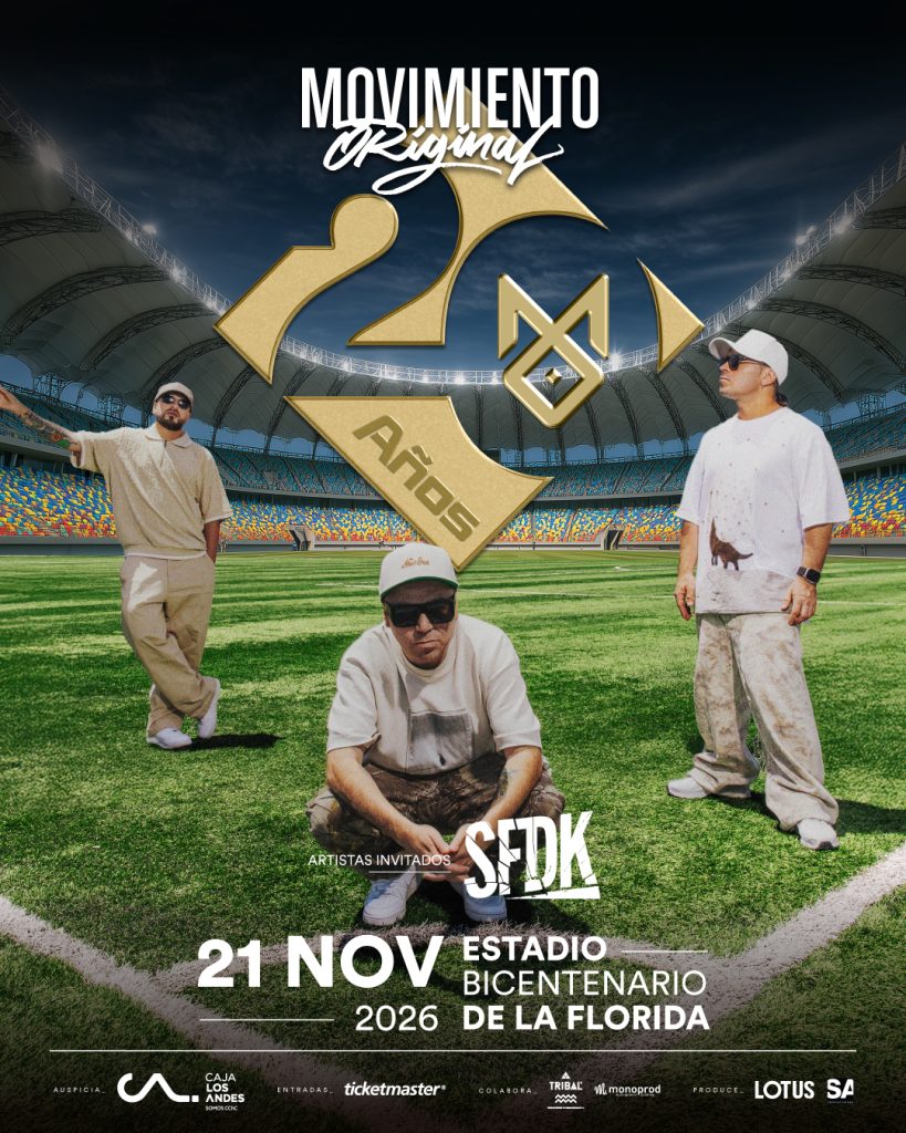 Una de las agrupaciones de hip-hop fundamentales de la escena nacional, Movimiento Original celebrará dos décadas de éxitos con un concierto en el Estadio Bicentenario de La Florida. Este evento marca un hito en su carrera, y sigue al lleno total del Movistar Arena el 2024. El show promete una presentación cargada de grandes éxitos, invitados y momentos únicos que capturan la esencia del grupo. Los primeros confirmados para esta celebración y con un show de larga duración es SFDK, uno de los grupos más icónicos de la historia de la música Hip-Hop en castellano y con 30 años de carrera.