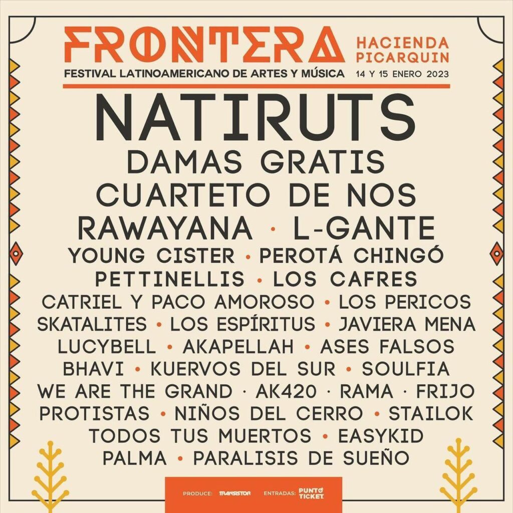 Dos jornadas memorables con 30 agrupaciones en total que integran el Cartel de Frontera 2023: Natiruts, Damas Gratis, Cuarteto de Nos, L-Gante, Young Cister, Rawayana, Perotá Chingó, Pettinellis, Los Cafres, Akapellah, Ases Falsos, Los Pericos, Skatalites, Los Espíritus, Javiera Mena, Stailok, Frijo, Lucybell, Catriel y Paco Amoroso, Bhavi, Kuervos del Sur, Soulfia, We Are The Grand, AK4:20, Rama, Protistas, Niños del Cerro, Todos tus muertos, Easykid, PALMA y Parálisis del sueño.