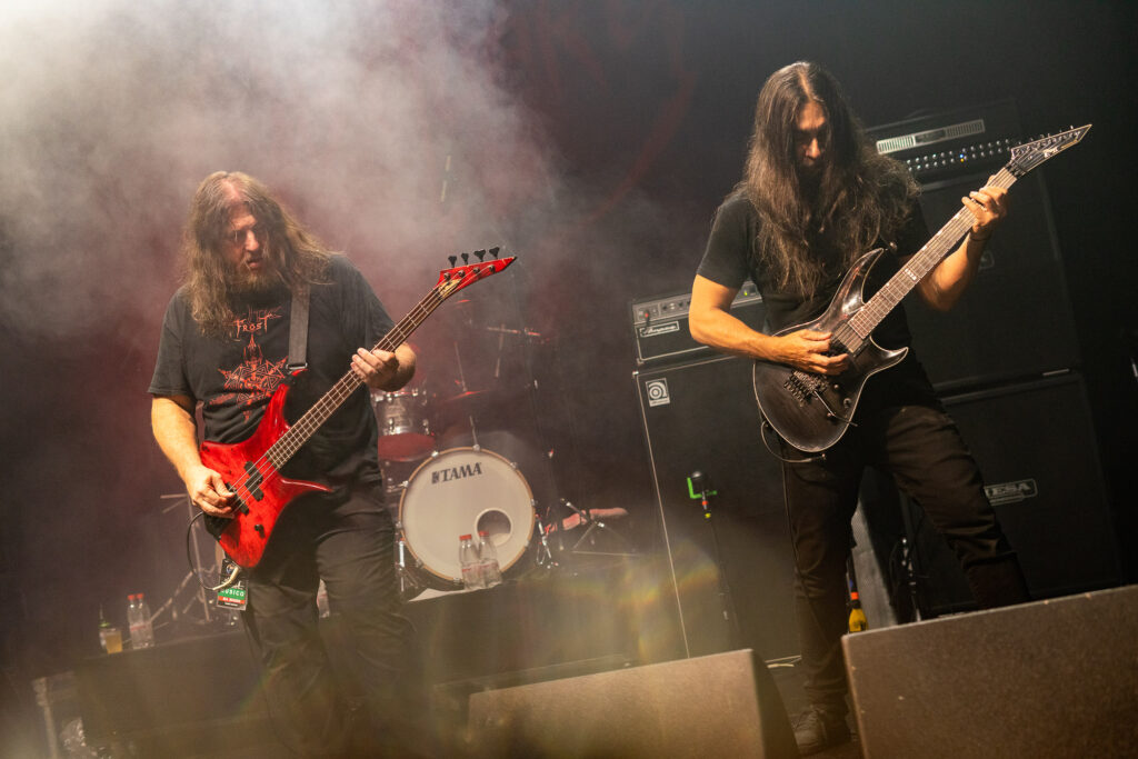 La legendaria banda precursora del Death Metal entró a su espectáculo con colosal introducción, dando inicio a su «Complete Control Tour of Latinomerica”. La audiencia se precipitó lenta como fuerte contra el escenario que las barreras de seguridad seguridad comenzaron a rechinar bajo la febril atmósfera. El concierto de Obituary hizo un recorrido por el bioma abismal y las dunas infernales que han escrito décadas de grandes éxitos así como de los más nuevos. Los puños se levantaron para corear al ritmo de temas como «Redneck Stomp”, «Sentence Day”, «Visions in My Head”, «Find the Arise”, «Don’t Care”, «By the Light” y muchas más. Aproximadamente 14 temas de violencia extrema y demoledores bombos rompieron las puertas de las infernales neblinas asfixiantes que oscurecieron toda la noche para terminar lentamente en la reducción esquelética al son «Slowly We Rot”.