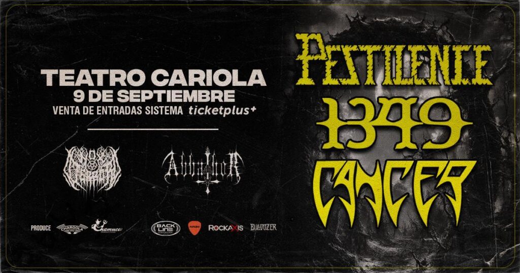 Desde las profundidades más abisales del infierno, la trinidad satánica formada por Pestilence, 1349 y Cancer ascenderá al escenario del Teatro Cariola este 9 de septiembre. Rodeados por un mar negro de fieles devotos, desatarán un ritual blasfemo en una noche de oscuridad absoluta, corrompiendo hasta el último vestigio de salvación en el alma de los presentes.