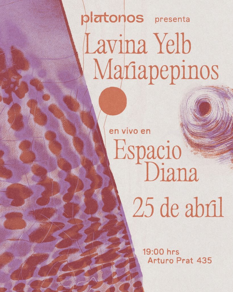 El próximo sábado 25 de abril a las 19:00 horas se presentarán en vivo en Espacio Diana, en un show doble, los proyectos musicales Lavina Yelb y Mariapepinos, sentando el primer hito de la emergente plataforma sonora Platonos, que ya cuenta con tickets a la venta para este primer concierto en PORTALTICKETS. Se pondrán a disposición 120 preventas hasta agotar stock y luego un precio de venta general hasta completar el aforo de 400 personas.