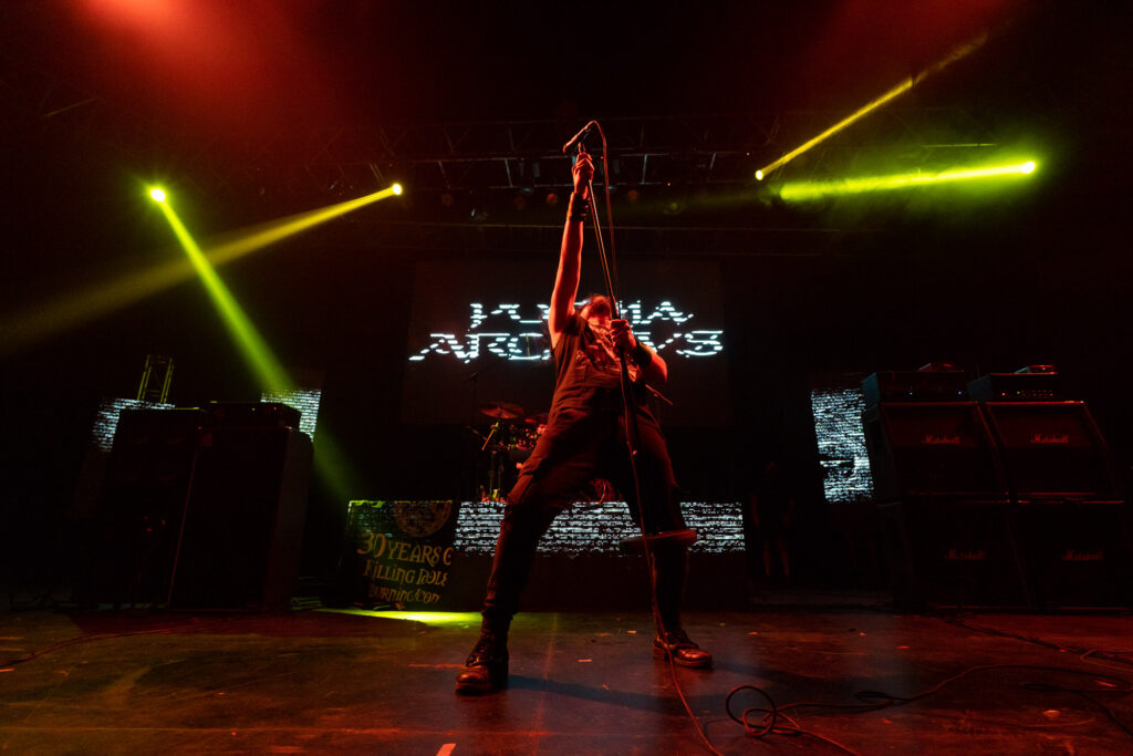 El público ardía en su vociferante ánimo, como estrellas que brillan por sí mismas y juntas en este basto y negro concierto. Y desde este punto tan brillante en el cosmos musical nos encontramos flagrantes en el tema «Kingdom of Ruins», en la decadencia orquestada de este o cualquier mundo en continuidad de acción.