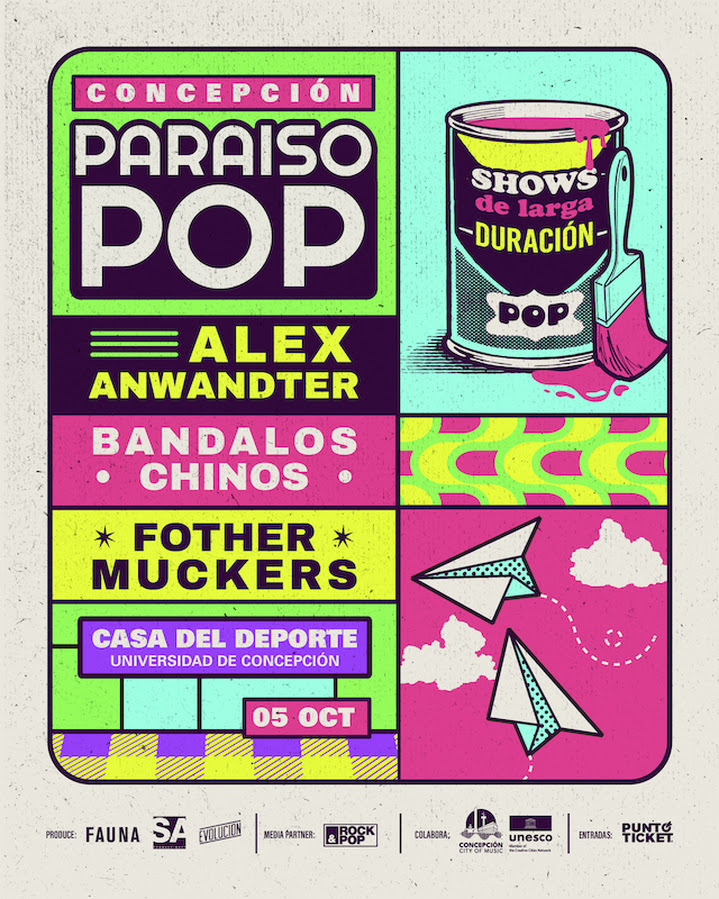 La primera edición de Paraíso Pop, que se realizará el próximo 03 de octubre en Movistar Arena, llegará hasta Concepción. Así es como el 05 de octubre en Casa del Deporte (Universidad de Concepción), Alex Anwandter, Fother Muckers y Bandalos Chinos llevarán a cabo una jornada única e inolvidable de música en vivo. Para este hito tres grandes nombres de la música latinoamericana mostrarán cada uno un show de larga duración y por primera vez juntos.