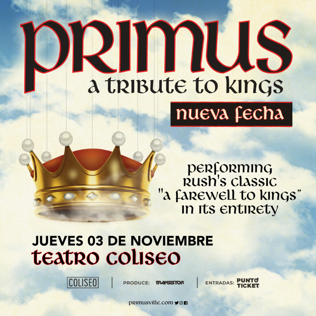 Como parte de su gira mundial «Atribute to Kings Tour», Primus llegará a Chile para estremecer el escenario del Teatro Coliseo. Tras agotar las entradas de su primera fecha, el grupo de rock estadounidense hará vibrar a sus fans con una segunda presentación este jueves 03 de noviembre, donde rendirán homenaje al legado de Rush con el disco de 1977 «A Farewell to kings».