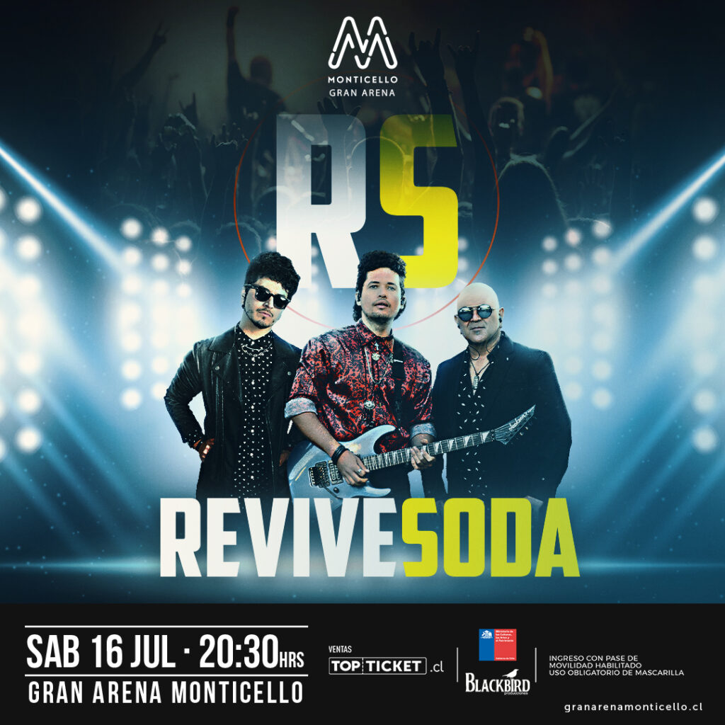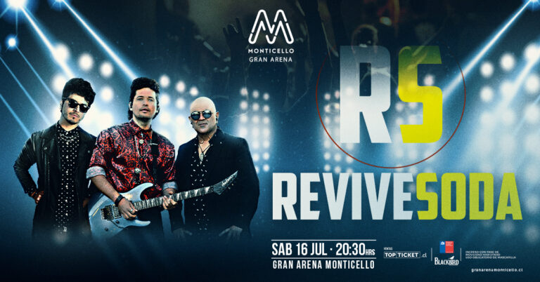 La agrupación chilena Revive Soda llega a Gran Arena Monticello el próximo sábado 16 de julio con un show que pondrá en el escenario a la mítica banda Soda Stereo, con los grandes clásicos que aún siguen vigentes, ya que el trío nacional ha sorprendido a miles de personas con la similitud musical y de estilo que logran. Las entradas están a la venta por el sistema Topticket.cl.
