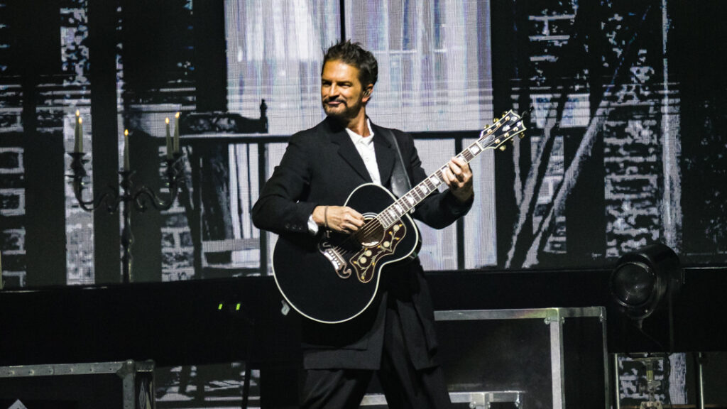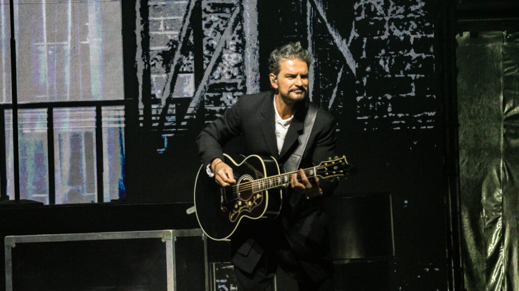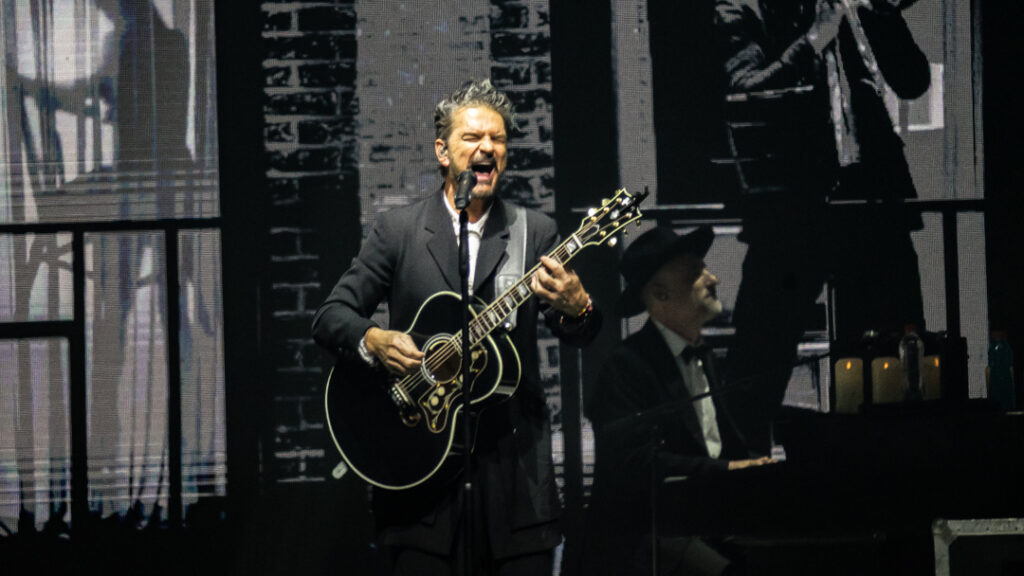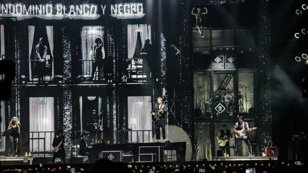 A la espera del artista guatemalteco, es momento de apreciar la gran producción de su gira: pantallas gigantes a los costados, escenario con escenografía urbana; por un lado la banqueta de una plaza, por el otro, un teléfono estilo londinense, luces rojas y tarimas negras, adornaban este excepcional despliegue que simulaba ser un condominio, cuyo nombre era “Blanco y Negro”, aludiendo a su último álbum de estudio con el mismo nombre, lanzado en 2020. Ya son las 21:15 y sus músicos salen a escena, todos vestidos de blanco y negro para hacer una introducción musical antes de la aparición de Ricardo Arjona, quien sale a escena para interpretarnos «Si Yo Fuera» con un outfit también en lo tonos -camisa blanca, pantalón y chaqueta gillette negra combinado con zapatillas estilo converse-. La coherencia de su espectáculo no deja detalle al azar y se nota. Con un total de 27 canciones en el setlist, continúa con «Morir por Vivir» y «Ella», las cámaras graban todos sus movimientos, mientras los gritos no se dejan esperar para seguir con «Hongos», canción de su último disco. Suena «Apnea» y el público activa el modo karaoke, pero no fue hasta que interpretó «Acompáñame a estar Solo» que la pasión se apodera de los cuerpos, y no hay alma en el recinto que no coree cada palabra de este éxito. Si el ambiente ya estaba encendido, ahora se pone romántico con «El Amor» y las parejas se abrazan y dedican cada palabra de esta oda al amor y sus vicisitudes. Una pausa para saludar a su público chileno, a sus cientos de fanáticas, y entregarnos una reflexión en torno a los problemas que hemos vivido últimamente por la pandemia y sus consecuencias, además tocó temas actuales como las redes sociales, la identidad de género y hasta el lenguaje inclusivo, los cuales tildó de “estupideces”. Especial discurso, un tanto obsoleto para los tiempos que corren, todo esto para introducir la canción «El Problema».
