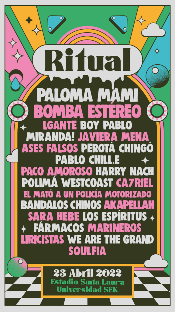 Con Paloma Mami como número principal y Bomba Estéreo encabezando el cartel, en total serán 23 icónicos artistas del género urbano, pop e indie rock nacional e internacional que darán vida a Ritual, que se llevará a cabo el 23 de abril de 2022 en el Estadio Santa Laura, uno de los principales recintos de Chile.