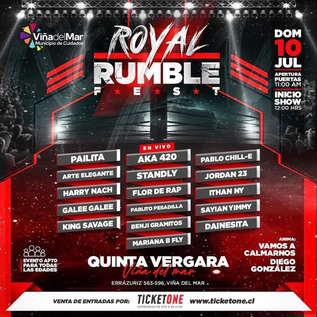 Noticias como ésta dieron un pie de partida para que se creara Royal Rumble Fest, un concierto especializado que vendió en 2 días más de 5 mil tickets, y que reunirá a los exponentes urbanos más relevantes de la escena. El evento se desarrollará el próximo 10 de julio en la Quinta Vergara, espacio donde se ha levantado por décadas el reconocido Festival Internacional de la Canción de Viña del Mar. La propuesta de los creadores del certamen es hacer posible un festival familiar, pensando en la transversalidad que la música urbana tiene entre sus seguidores.
