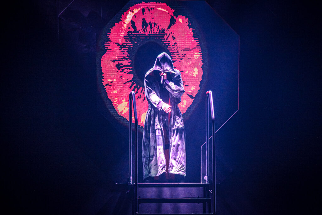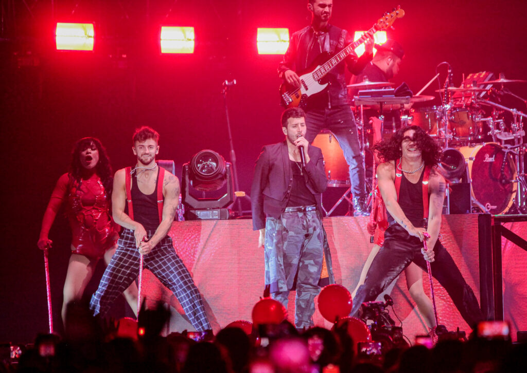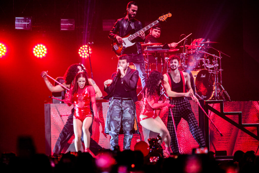 Su espectáculo sucedió entre una escalera, los extremos de escenario que no quedaron ausentes de él y un espectáculo representado -fundamentalmente- por el joven grupo de bailarines que lo apoyó segundo a segundo, versátiles entre tonos escarlatas y transparencias negras. Fue aquí donde notamos de inmediato que el espectáculo sería de lo más entretenido y voluble.