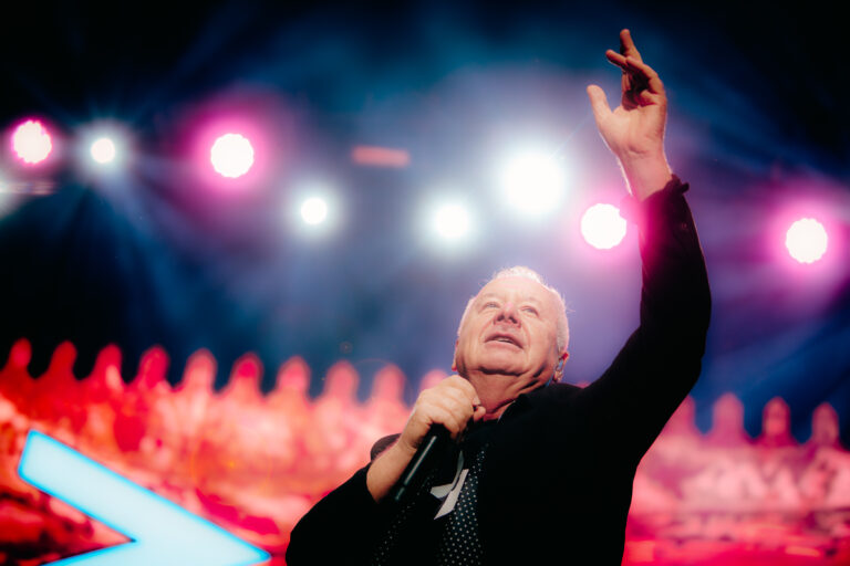 Luego de tal apertura, caía al escenario Simple Minds liderado por un carismático e impecable Jim Kerr que dejaba caer “Waterfront” de su excelente álbum “Sparkle In The Rain” (1984) y “Speed Your Love To Me”. Un inicio demoledor en conjunto con un “Hola Santiago” de Kerr para teletransportarnos a la década de 1980 y convertir, a través de las clásicas atmósferas de la banda, el Movistar Arena en el escenario de cualquier baile de graduación retro.