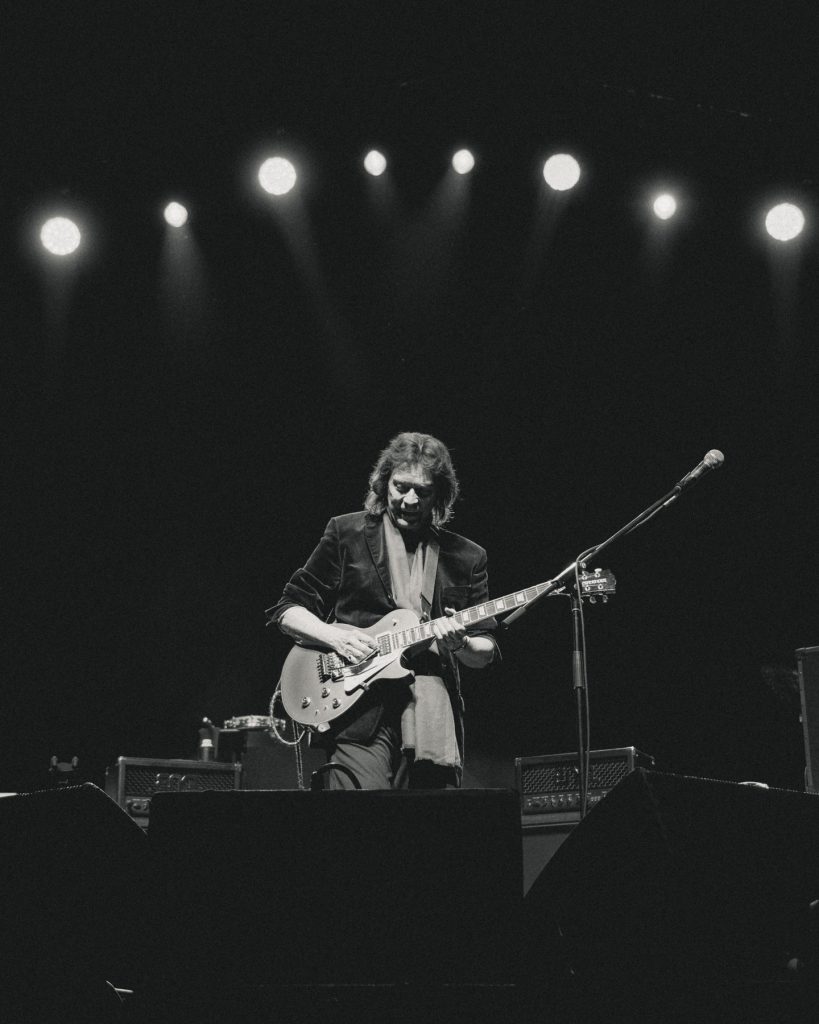 Agendado media hora antes de lo habitual ¿La razón? Al parecer iba a ser una noche intensa donde las canciones largas iban a ser las protagonistas, me dejaba en duda si un Steve de más de 70 años era capaz de rendir esas dos horas prometidas de show y lograr la majestuosidad interpretativa de su repertorio. Todas esas impresiones llegaban a mi mientras repentinamente las luces desaparecen hasta dejar en plena oscuridad al teatro, pues la leyenda de las 6 cuerdas ya estaba sobre el escenario. Vestido de negro y con esa bufanda morada que inconscientemente ya es parte de él.
