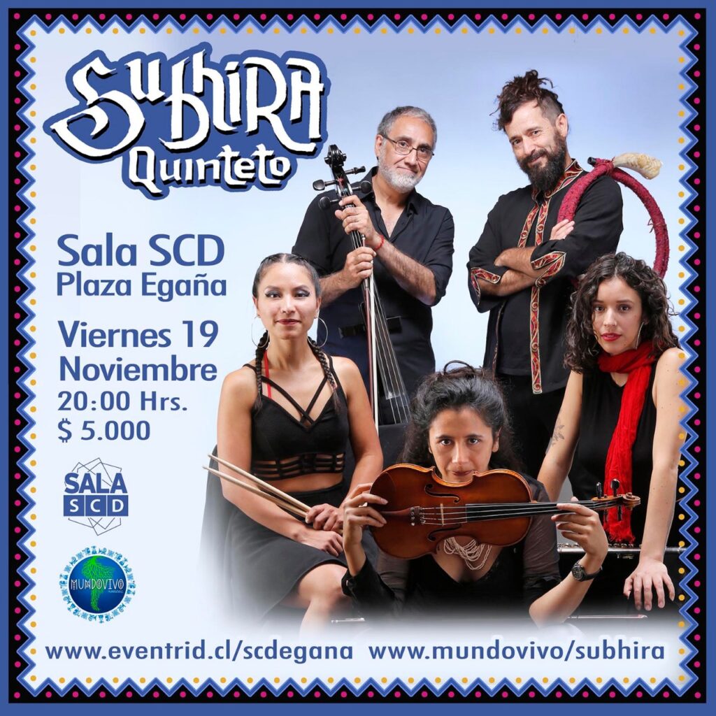 Este viernes 19, desde las 20:00 horas, se llevará a cabo en la Sala SCD de Plaza Egaña, la presentación de Subhira Quinteto, la agrupación que funde músicas de diversas culturas del mundo, interpretando con especial búsqueda los sonidos de pueblos originarios de América del Sur como Aymara, Mapuche, Selk’nam, entre otros.