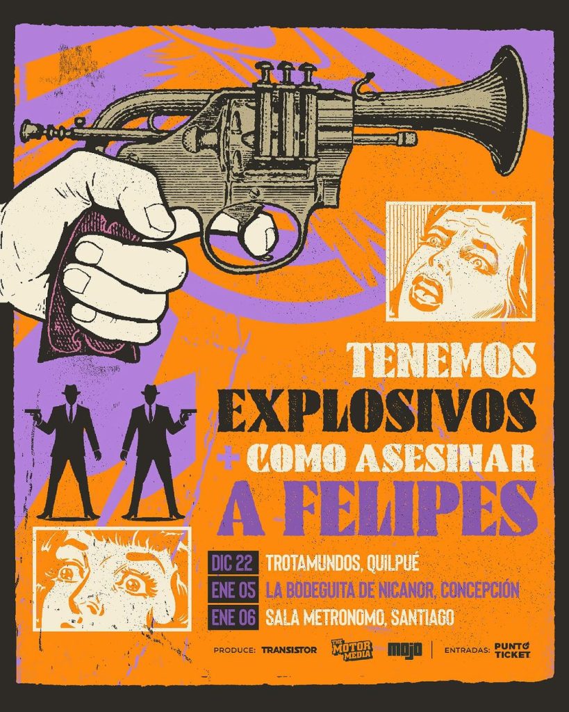 Tenemos Explosivos, una de las bandas revelación de la música chilena contemporánea, anuncia fechas por algunas ciudades del país comenzando el 22 de diciembre en Trotamundos de Quilpué para el 5 de enero del 2024 viajar al sur y presentarse en la Bodeguita de Nicanor en Concepción, finalizando al día siguiente con un show en Santiago en Sala Metrónomo.