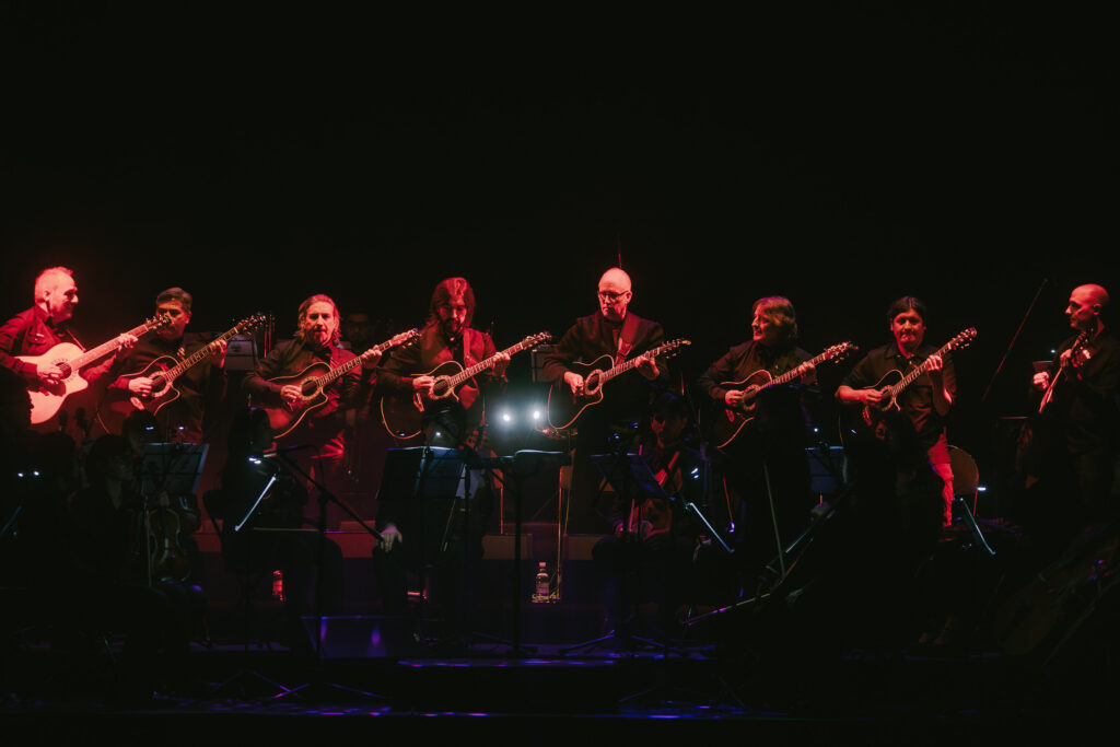 En la nave central, instrumentos y concertistas de la Orquesta de Cámara de Santiago buscando su punto de afinación bajo luces tenues tejen la arpillera que luego recibirá los colores de un octeto de guitarristas imaginativos y en multiplicación constante.