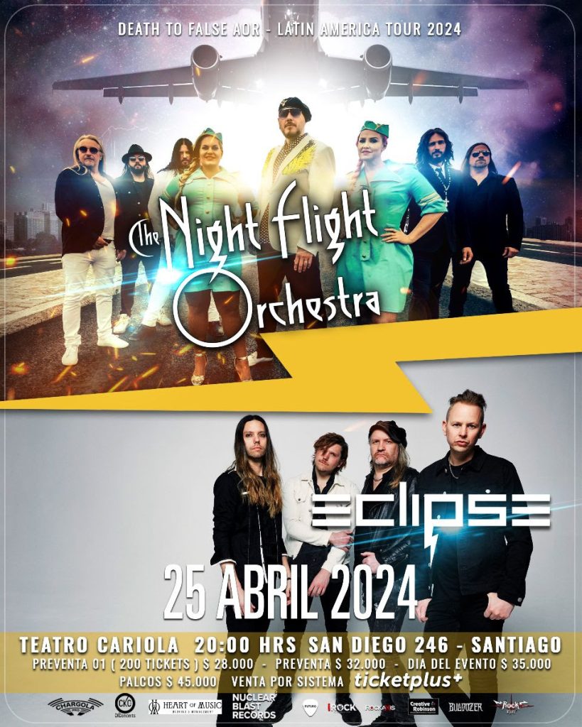 The Night Flight Orchestra llegará por primera vez a Chile en el marco de su gira “Death to False AOR – Latin America Tour 2024” y no llegarán solos, ya que se suma Eclipse, otra banda que hará su debut en nuestro país para presentar su más reciente trabajo discográfico “Megalomanium” recién estrenado a inicios de septiembre de este año. Las dos agrupaciones llegarán al Teatro Cariola en 2024, el próximo 25 de abril en un doble concierto que se vivirá solo en Chile, trayendo así lo mejor del Hard Rock contemporáneo sueco en una fiesta imperdible que promete ser inolvidable para los amantes del AOR.