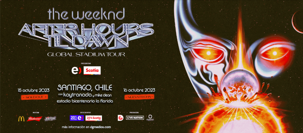 ¡Prepárense para una experiencia musical que los hará sentir el «After Hours Til Dawn Tour»! DG Medios trae al fenómeno del Pop y R&B Alternativo, y la emoción está en su punto máximo. The Weeknd aterrizará en Chile en poco más de un mes y duda será el evento del año, los cientos de fanáticos que agotaron las dos fechas agendadas por el artista, cuentan las horas para ver a The Weeknd en vivo, quien ha acumulado más de Mil millones de oyentes mensuales en Spotify, lo que lo convierte en el artista más escuchado de la plataforma.