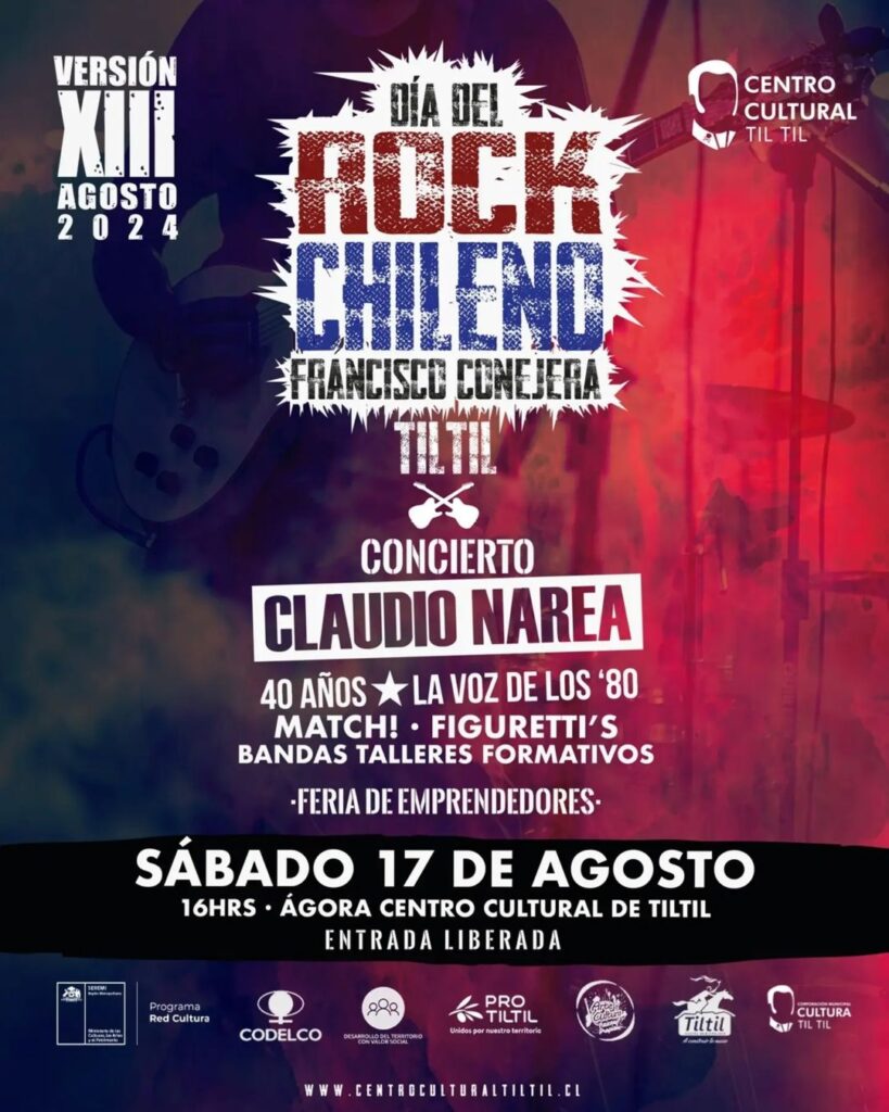 Para esta treceava versión 2024, Claudio Narea (Ex Los Prisioneros) será el encargado de encabezar el cartel de bandas, donde además se convocó a agrupaciones de músicos de Tiltil para integrarse a la parrilla de este importante encuentro que se realizará el sábado 17 de junio desde las 16 Hrs en el ágora del Centro Cultural Tiltil.