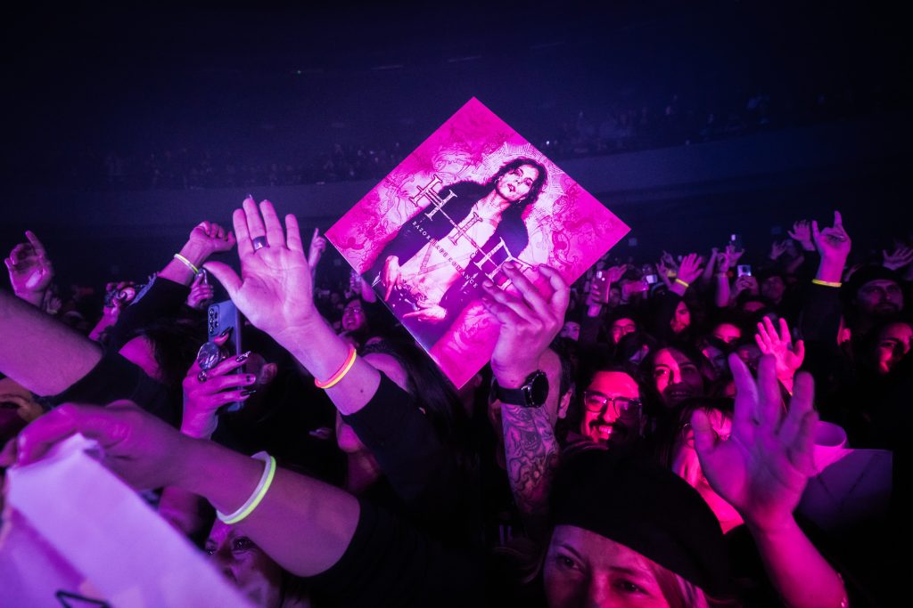 Un tridente de amor melancólico llega con «The Funeral of Hearts», «Neon Noir» y «Join Me In Death», todas cantadas por el público a todo pulmón, con la emoción contenida por 8 años de espera. La banda de apoyo suena afiatada y potente, formación clásica de batería, bajo y dos guitarras que se intercambiaban el liderazgo, además de las secuencias, cumpliendo con el propósito de hacernos sumergirnos en ese ‘ruidoso’ pero magnético campo sonoro que provocan las canciones de Ville Valo, a pesar que la voz no suele sobresalir nunca sobre la mezcla debido al vaivén de movimientos de Ville con su micrófono, pero esto para quienes siguen a HIM, ya es algo característico, pero que no se hacen problema alguno.