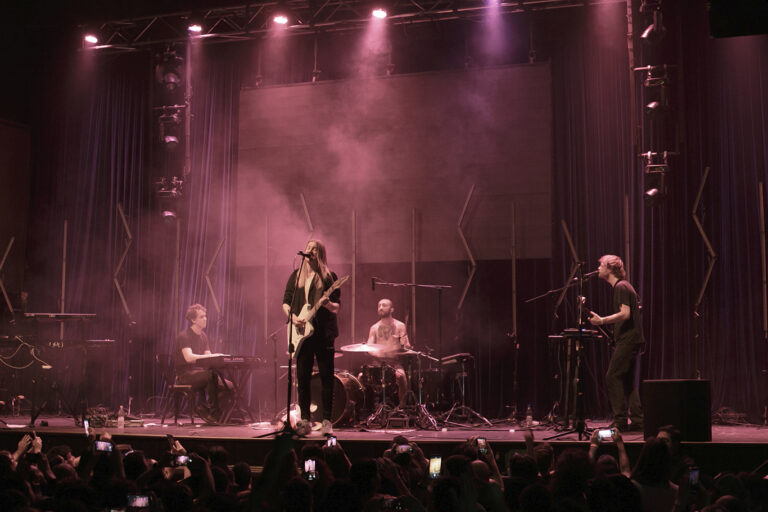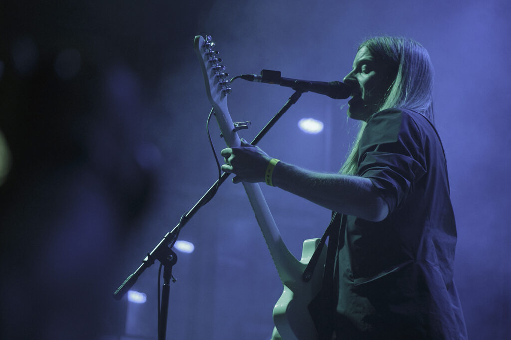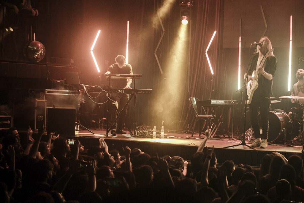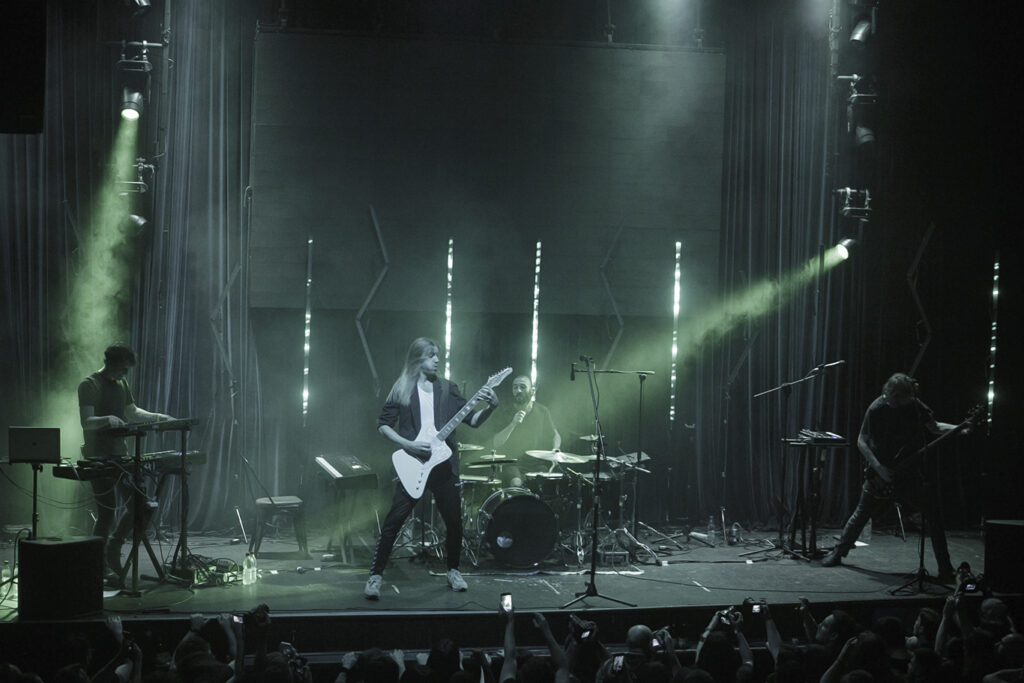 Además de la iluminación tradicional que se puede ver en un show, en el fondo como parte de la escenografía la banda tenía una serie de columnas de luces, que se iban encendiendo al ritmo de su música, que se iban pintando de diferentes colores y que, mezclado con el brutal sonido en vivo conseguido, lograron generar una atmósfera atrapante e inmersiva.