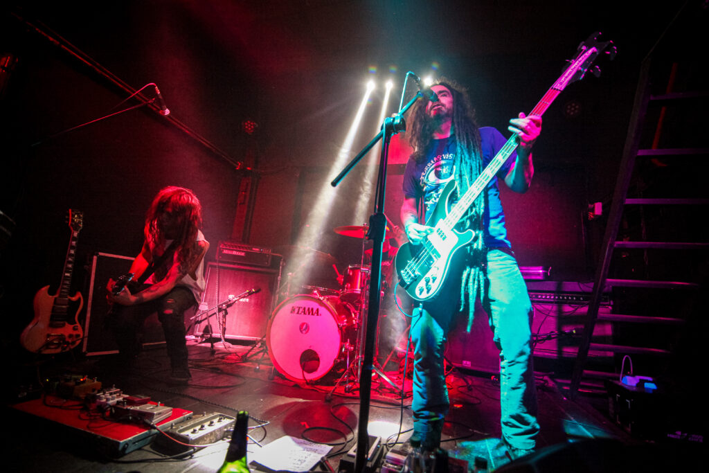 Sonido pesado suburbano, robusto y versátil adosado con juegos de voces en sueño sicotrópico envueltos en tonos ásperos y acoples certero. En medio del set saltaron chispas con Pappo en la frente, buscando la paz entre el caos bienvenido.